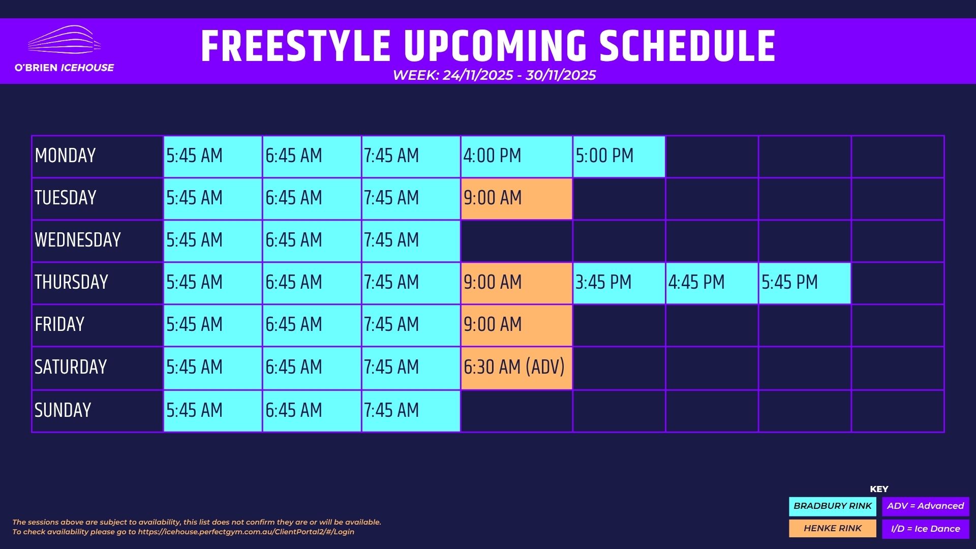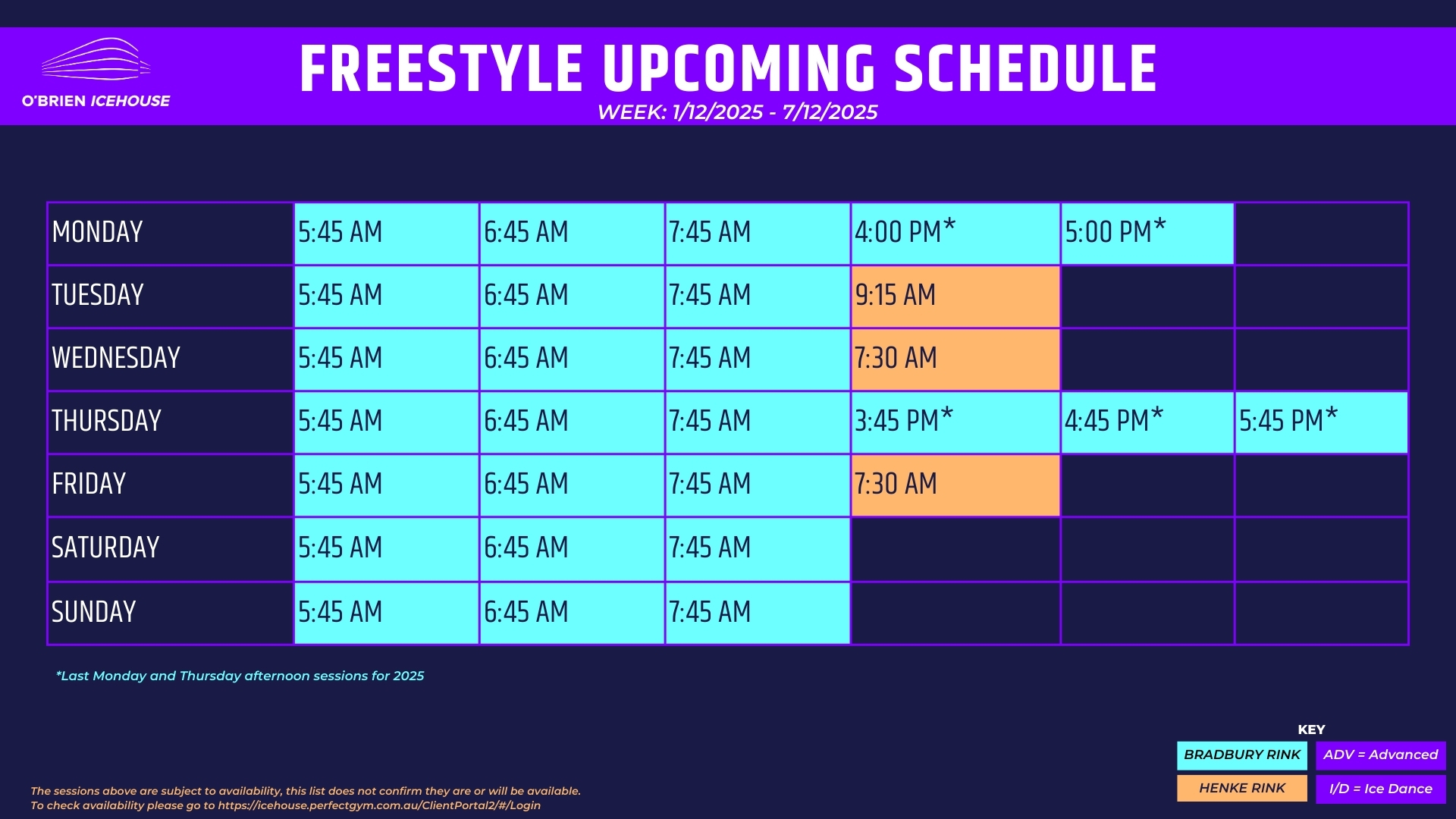 | OFF ICE: Strength/Conditioning + Jump Technique Classes TERM-BASED Classes. Enrol through Skate School. Adult Wednesday Class – 45 minutes Location: Ballet Room, Level 1 7:15pm-8:00pm (45-minutes) Term 4 2025: Wednesday, Oct 8 – Dec 10 10 weeks: $200 Enrolments Open: Sep 22, 2025 Youth & Adult Sunday Classes – 30 minutes Location: St Mortiz Bar, Level 1 Youth: 10:15am-10:45am Adult: 10:45am-11:15am Term 4 2025: Sunday, Oct 19 – Dec 14 (no classes Oct 26) 8 weeks: $108 Enrolments Open: Sep 22, 2025 Blackout Date in Term 4 2025: Oct 26 |