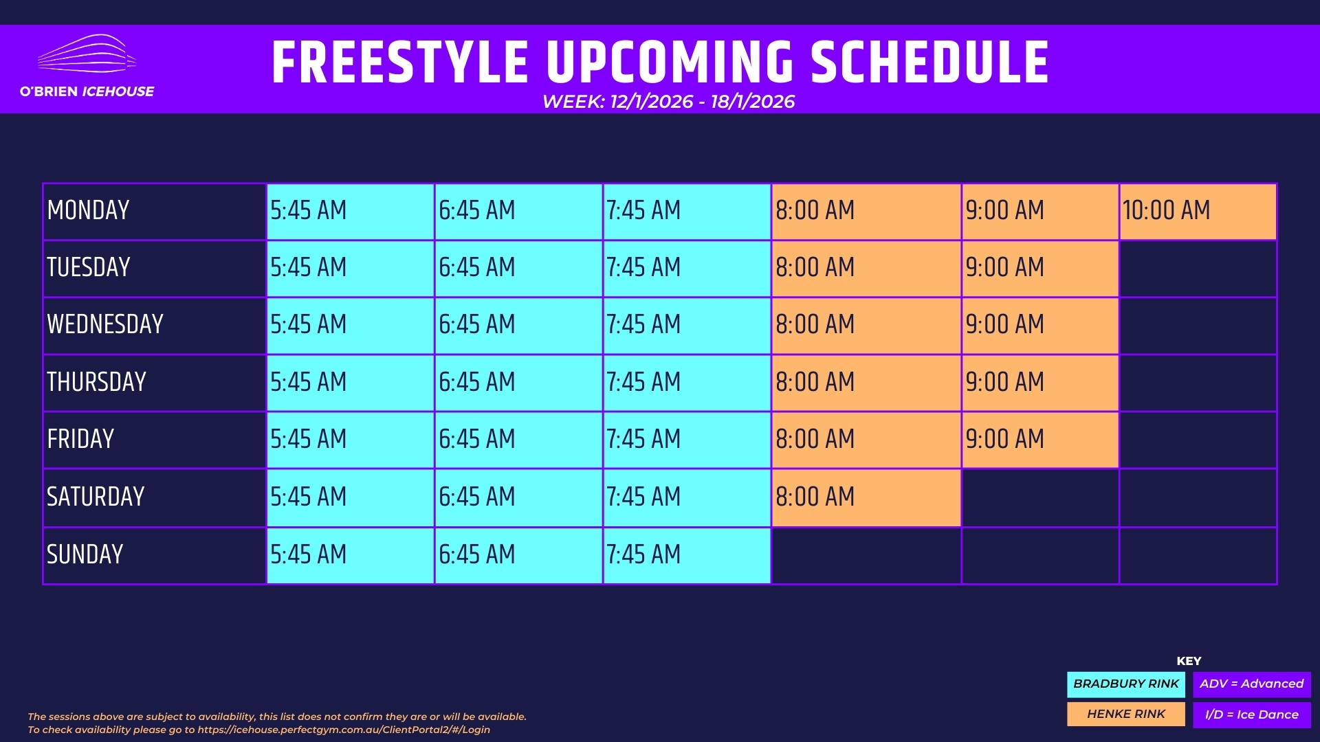| OFF ICE: Strength/Conditioning + Jump Technique Classes TERM-BASED Classes. Timetable (including price) is available on the Skate School webpage. Adult Wednesday Class – 45 minutes Location: Ballet Room, Level 1 7:15pm-8:00pm (45-minutes) Youth & Adult Sunday Classes – 30 minutes Location: St Mortiz Bar, Level 1 Youth: 10:15am-10:45am Adult: 10:45am-11:15am |