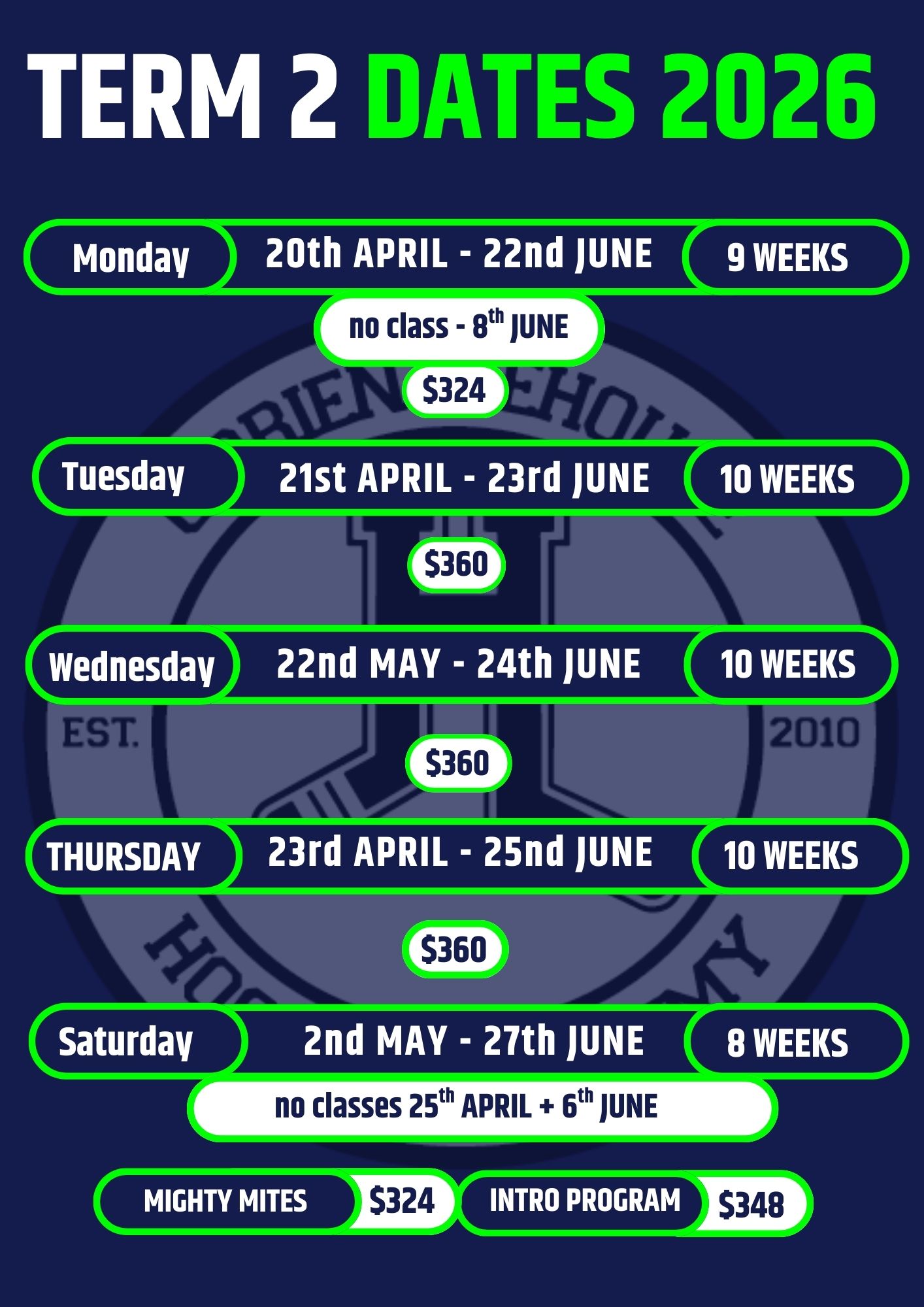 Due to high demand, we kindly ask that full payment for the term is made at the start of the program to secure your place.