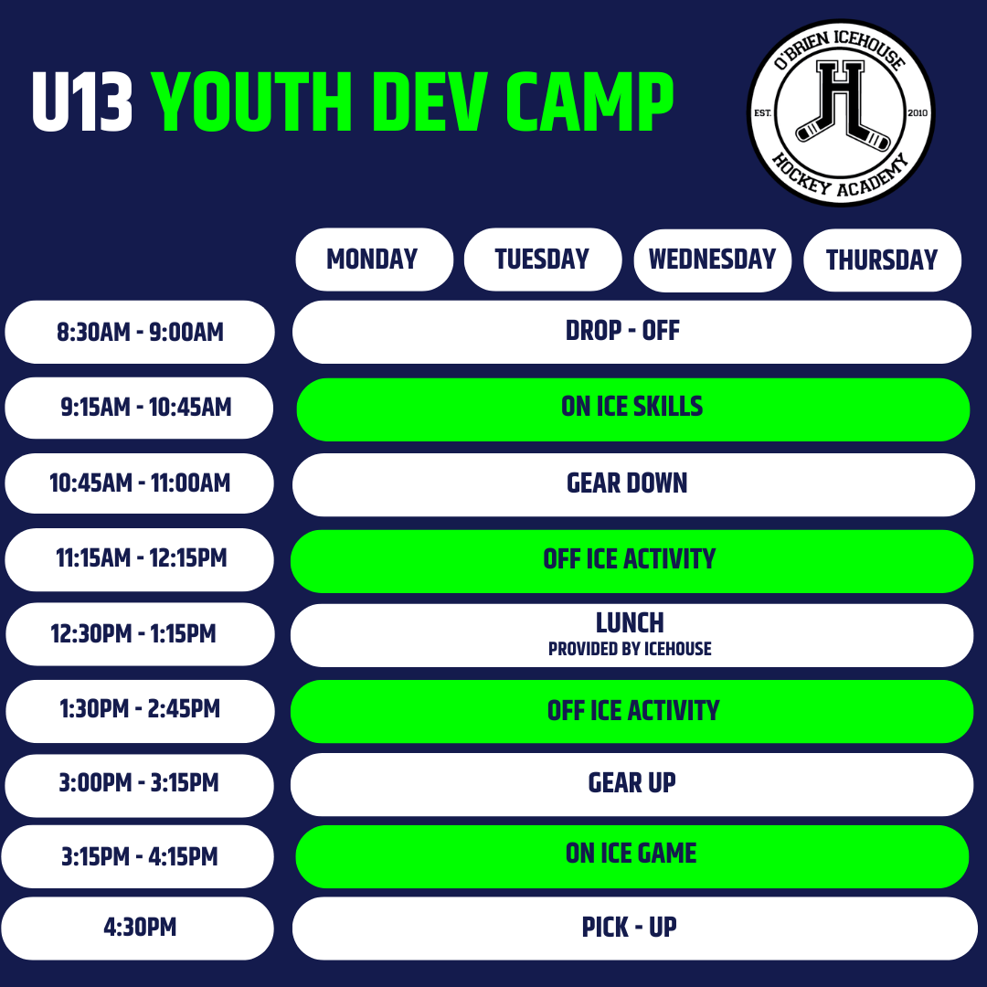 Our holiday camps run Monday to Thursday from 8:30am to 4:30pm, with over 10 hours of on-ice training, supervised off-ice activities, and lunch provided daily. It’s a safe, supportive environment where your child can build skills, stay active, and make great friends.