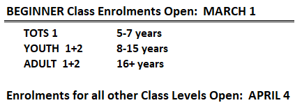 If you’ve had previous training and are not sure which class to enrol in, please refer to the Curriculum to assess your level. If you’re enrolling for the first time and not enrolling into a Tots 1, Youth 1+2, or Adult 1+2 level class: Create your account and then email [email protected] with your skill level. This level must be assigned to your account to enrol in the higher-level class.